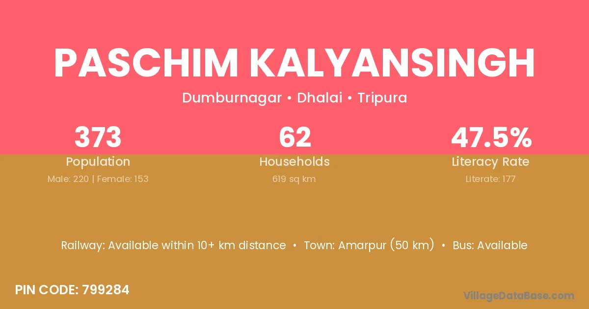 Amarpur (50 km) is the nearest town to Paschim Kalyansingh village for major economic activities and is located approximately 50 km away.