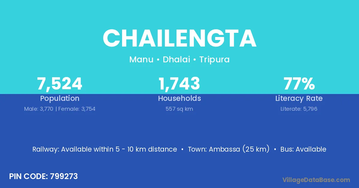 Ambassa (25 km) is the nearest town to Chailengta village for major economic activities and is located approximately 25 km away.
