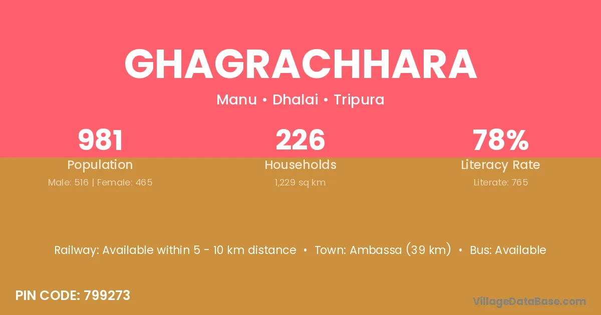 Ambassa (39 km) is the nearest town to Ghagrachhara village for major economic activities and is located approximately 39 km away.