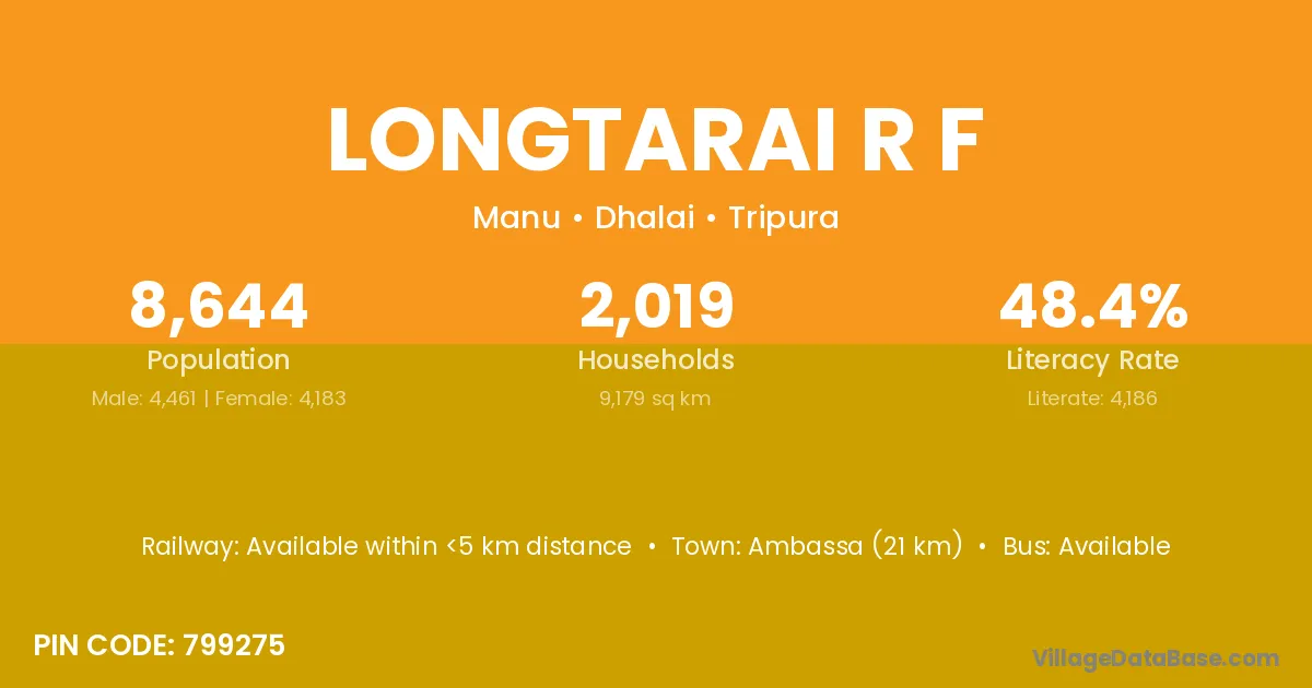 Ambassa (21 km) is the nearest town to Longtarai R F village for major economic activities and is located approximately 21 km away.