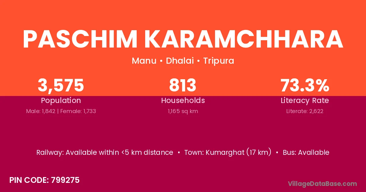 Kumarghat (17 km) is the nearest town to Paschim Karamchhara village for major economic activities and is located approximately 17 km away.