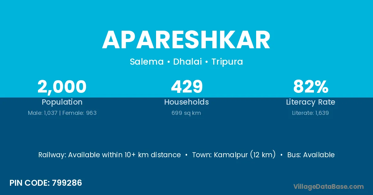 Kamalpur (12 km) is the nearest town to Apareshkar village for major economic activities and is located approximately 12 km away.