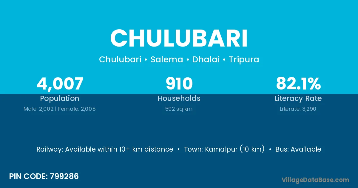 Chulubari village has a total population of 4,007 people, of which 2,002 are males and 2,005 are females.