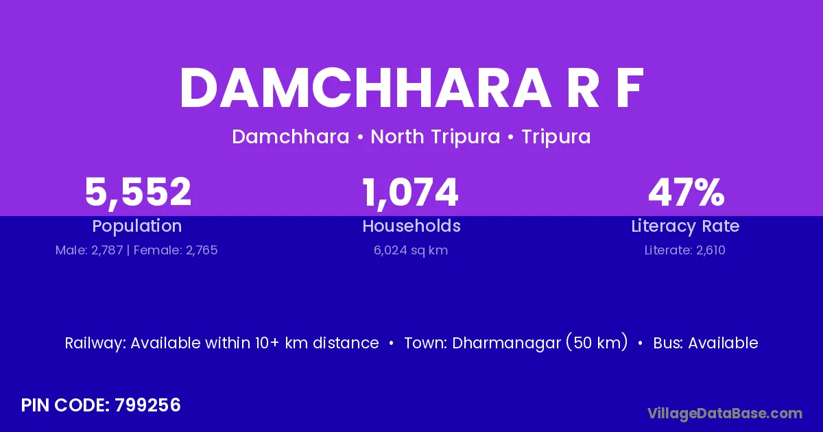 Damchhara R F village has a total population of 5,552 people, of which 2,787 are males and 2,765 are females.
