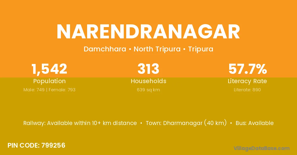 Dharmanagar (40 km) is the nearest town to Narendranagar village for major economic activities and is located approximately 40 km away.