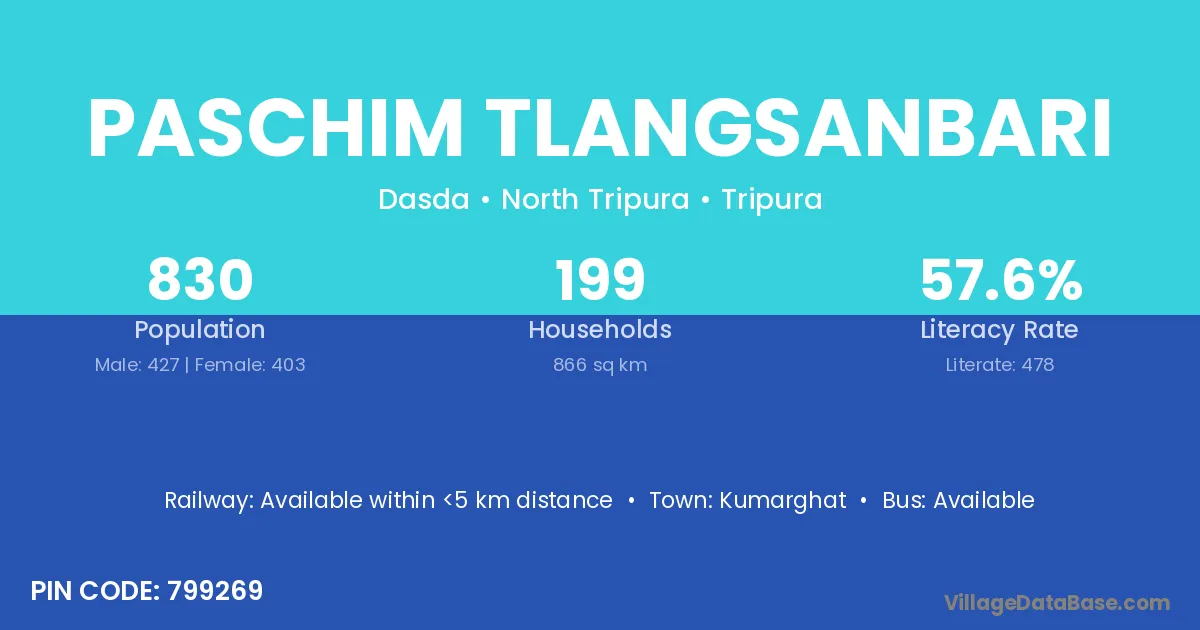 Paschim Tlangsanbari village has a total population of 830 people, of which 427 are males and 403 are females.
