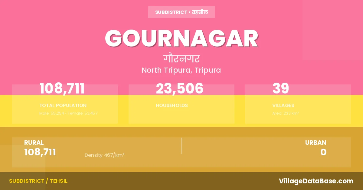 According to the 2011 census The total area of Gournagar Subdivision is 233 km², with a population of 108711 people. The population density is 467 inhabitants per square kilometre, and there are approximately 23506 houses in the sub district.