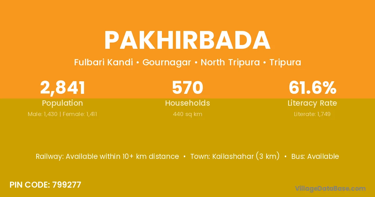 Kailashahar (3 km) is the nearest town to Pakhirbada village for major economic activities and is located approximately 3 km away.