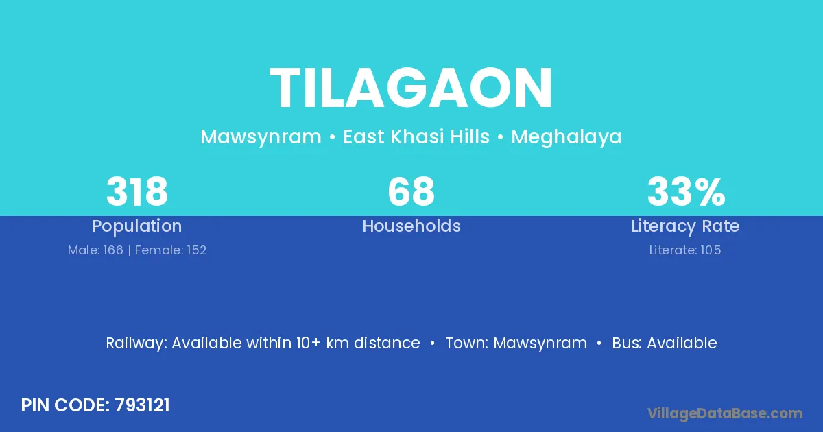 Kailashahar (4 km) is the nearest town to Tilagaon village for major economic activities and is located approximately 4 km away.
