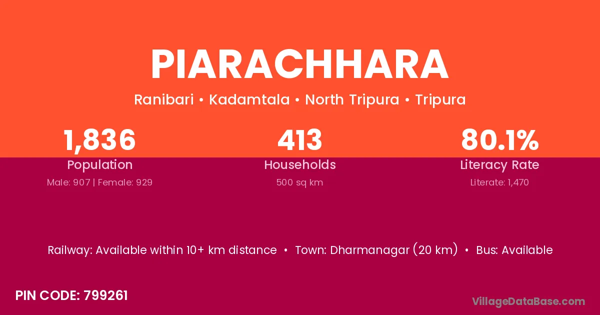 Dharmanagar (20 km) is the nearest town to Piarachhara village for major economic activities and is located approximately 20 km away.
