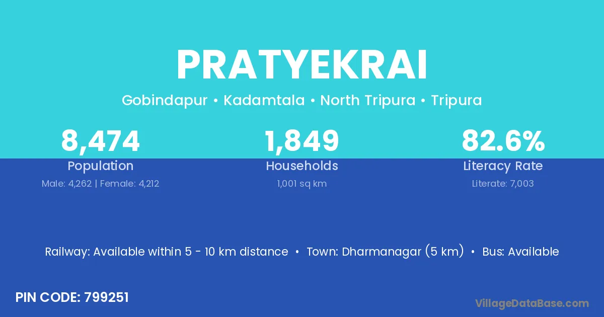 Dharmanagar (5 km) is the nearest town to Pratyekrai village for major economic activities and is located approximately 5 km away.