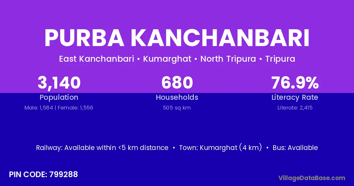 Kumarghat (4 km) is the nearest town to Purba Kanchanbari village for major economic activities and is located approximately 4 km away.