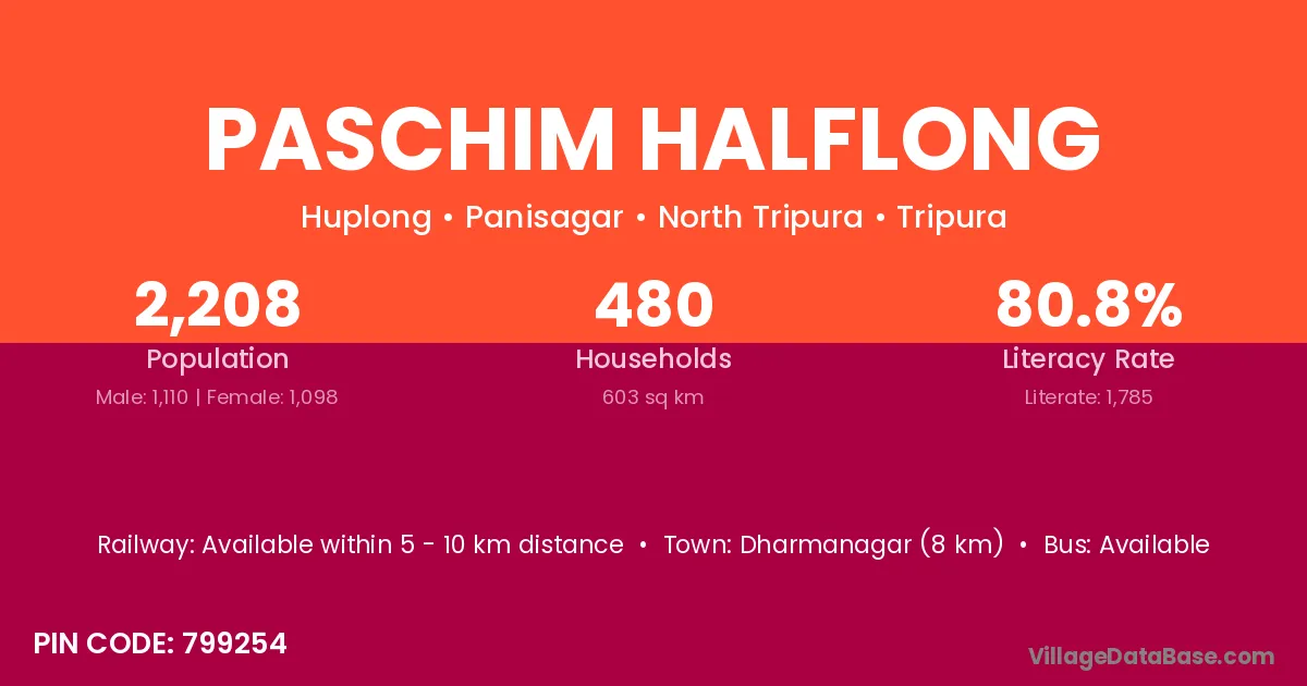 Dharmanagar (8 km) is the nearest town to Paschim Halflong village for major economic activities and is located approximately 8 km away.