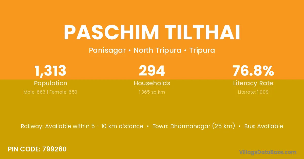 Dharmanagar (25 km) is the nearest town to Paschim Tilthai village for major economic activities and is located approximately 25 km away.