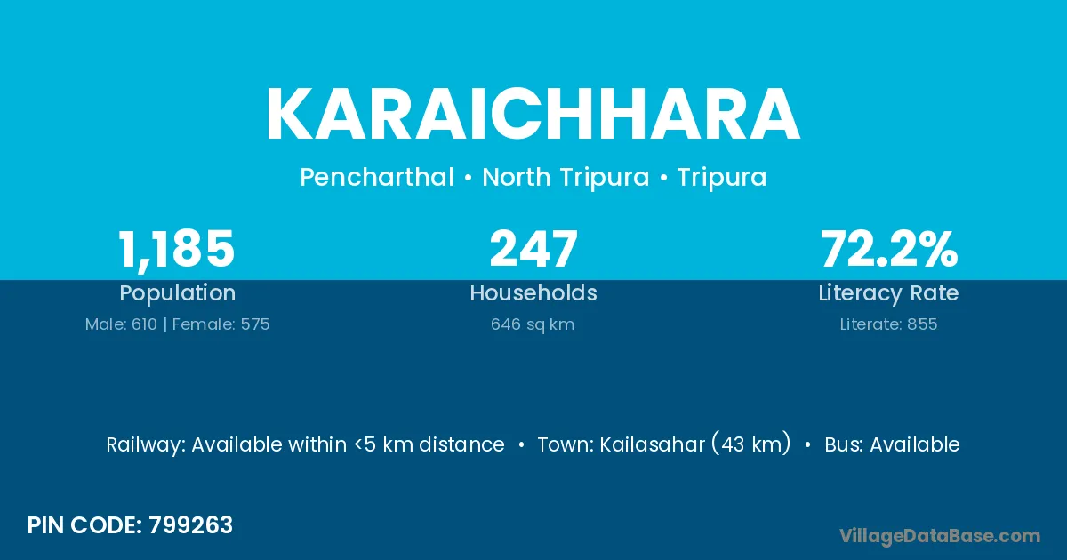 Kailasahar (43 km) is the nearest town to Karaichhara village for major economic activities and is located approximately 43 km away.