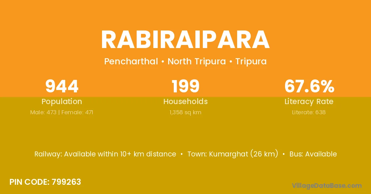 Kumarghat (26 km) is the nearest town to Rabiraipara village for major economic activities and is located approximately 26 km away.