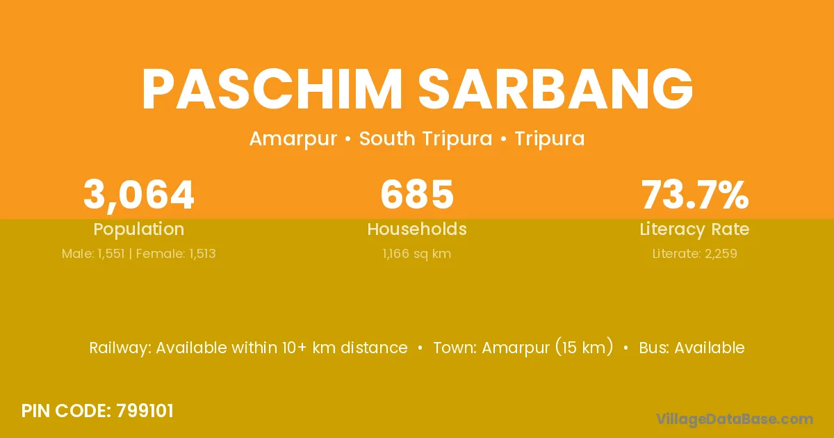 Amarpur (15 km) is the nearest town to Paschim Sarbang village for major economic activities and is located approximately 15 km away.