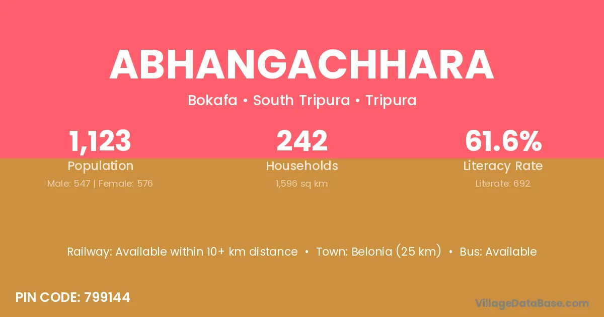 Belonia (25 km) is the nearest town to Abhangachhara village for major economic activities and is located approximately 25 km away.