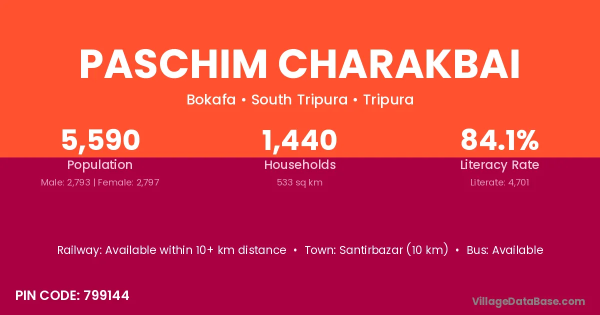 Paschim Charakbai village has a total population of 5,590 people, of which 2,793 are males and 2,797 are females.