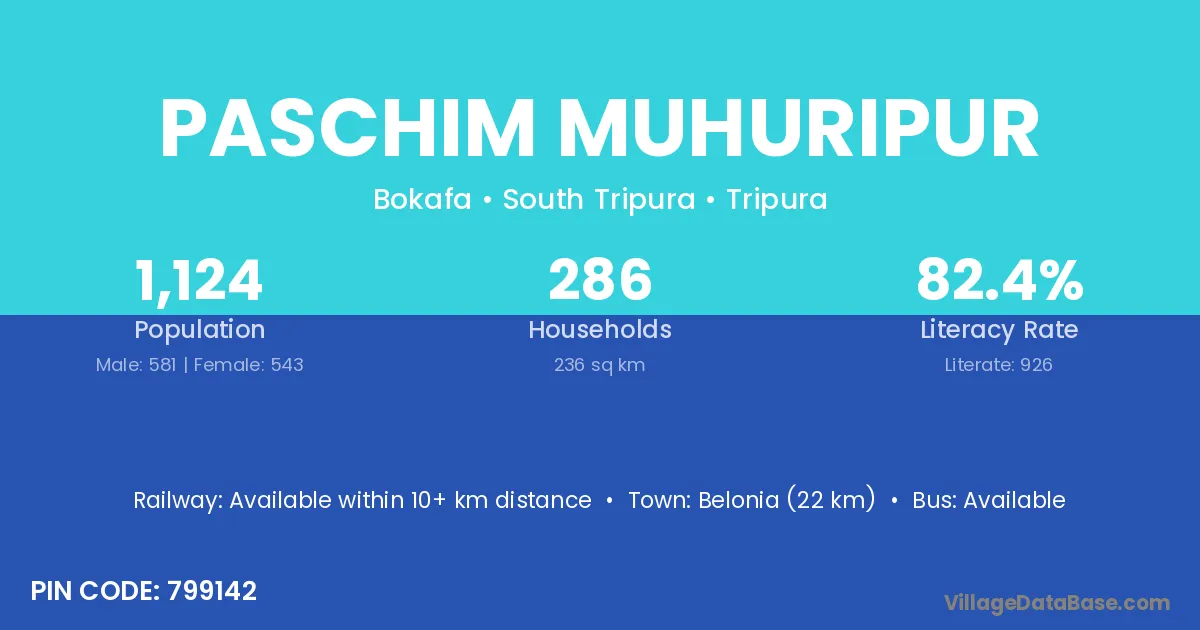 Belonia (22 km) is the nearest town to Paschim Muhuripur village for major economic activities and is located approximately 22 km away.