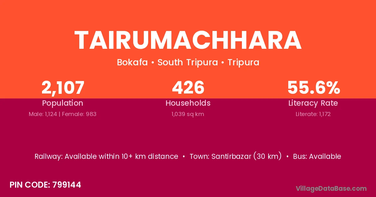 Santirbazar (30 km) is the nearest town to Tairumachhara village for major economic activities and is located approximately 30 km away.