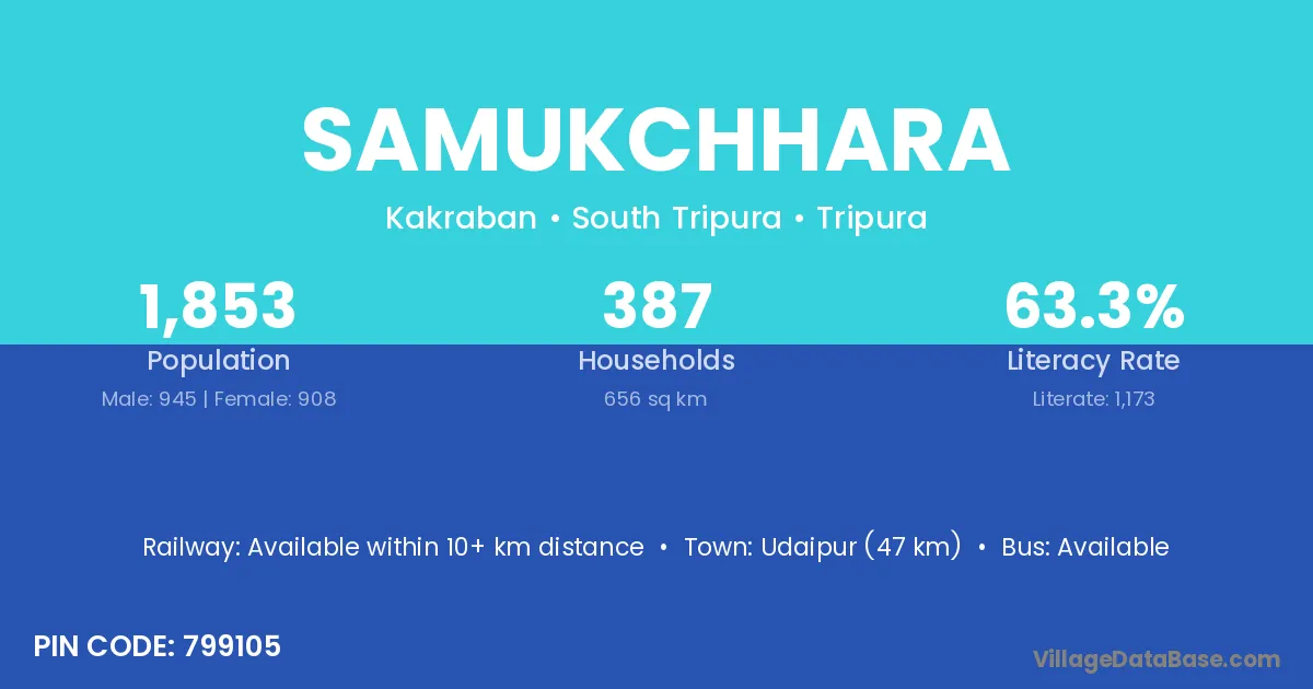 Udaipur (47 km) is the nearest town to Samukchhara village for major economic activities and is located approximately 47 km away.