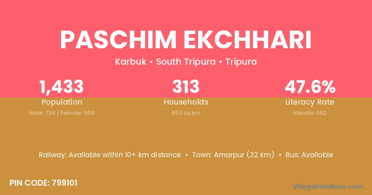 Amarpur (32 km) is the nearest town to Paschim Ekchhari village for major economic activities and is located approximately 32 km away.