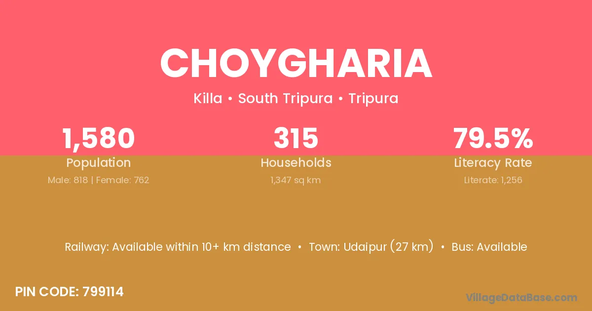 Udaipur (27 km) is the nearest town to Choygharia village for major economic activities and is located approximately 27 km away.