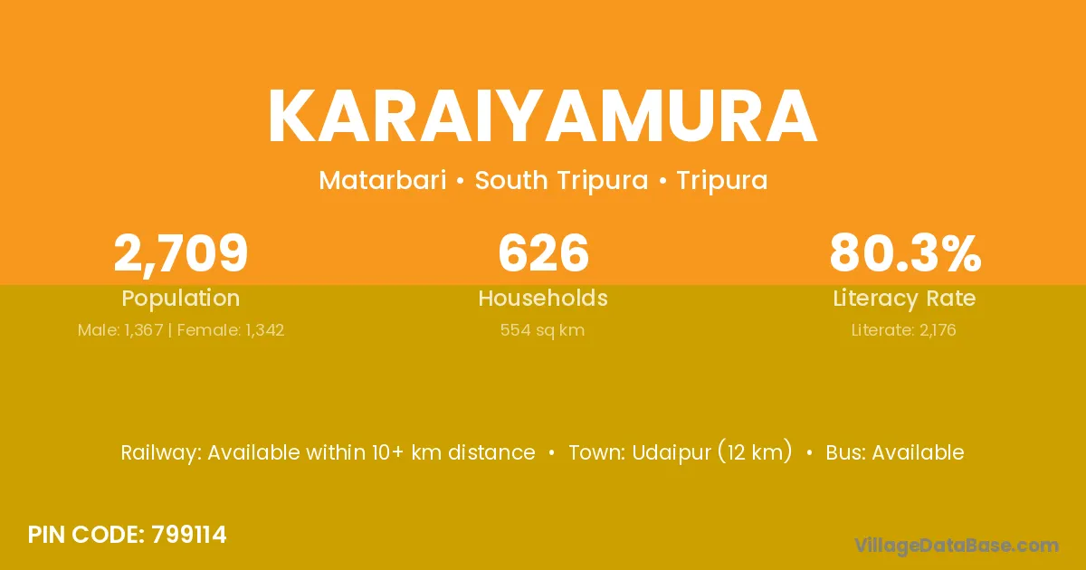 Udaipur (12 km) is the nearest town to Karaiyamura village for major economic activities and is located approximately 12 km away.