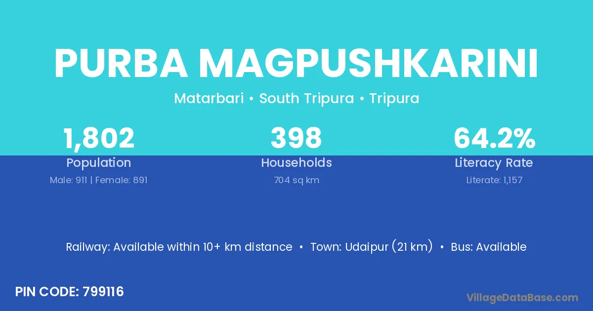 Udaipur (21 km) is the nearest town to Purba Magpushkarini village for major economic activities and is located approximately 21 km away.