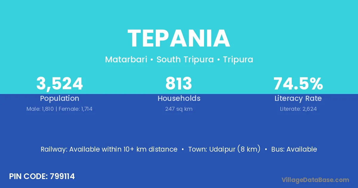 Tepania village has a total population of 3,524 people, of which 1,810 are males and 1,714 are females.