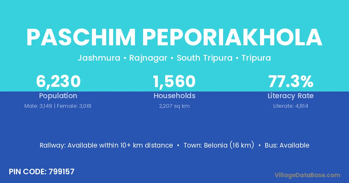 Belonia (16 km) is the nearest town to Paschim Peporiakhola village for major economic activities and is located approximately 16 km away.