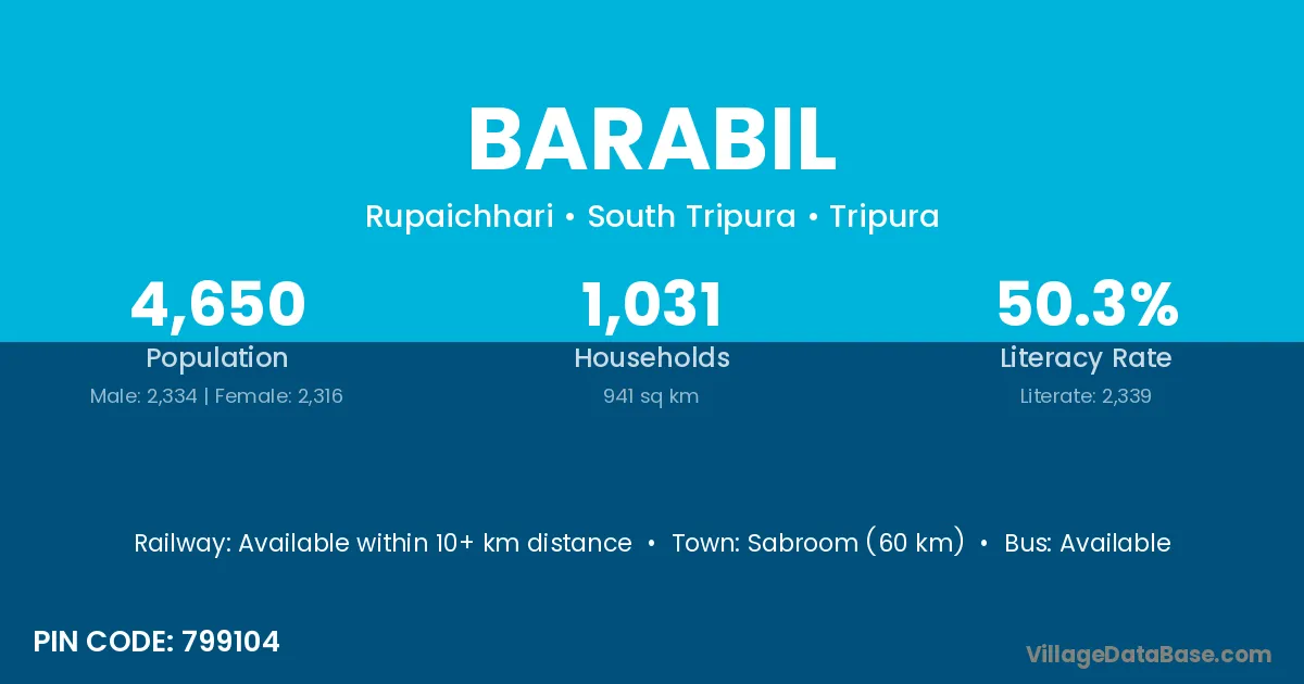 Sabroom (60 km) is the nearest town to Barabil village for major economic activities and is located approximately 60 km away.