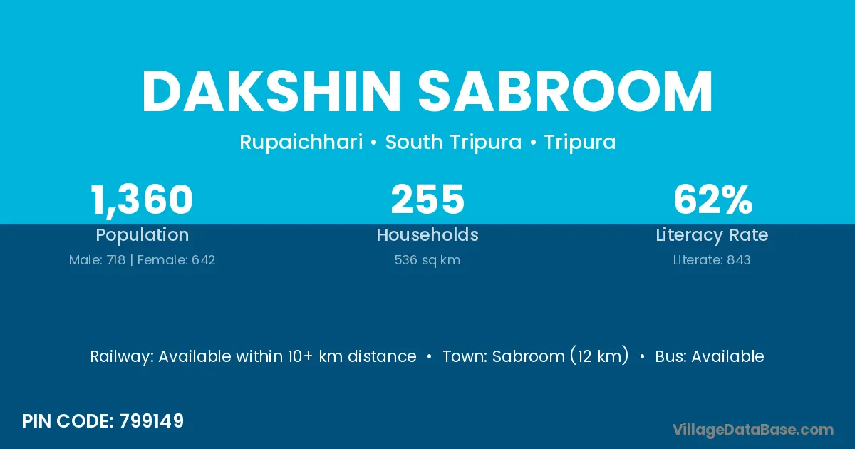 Dakshin Sabroom village has a total population of 1,360 people, of which 718 are males and 642 are females.