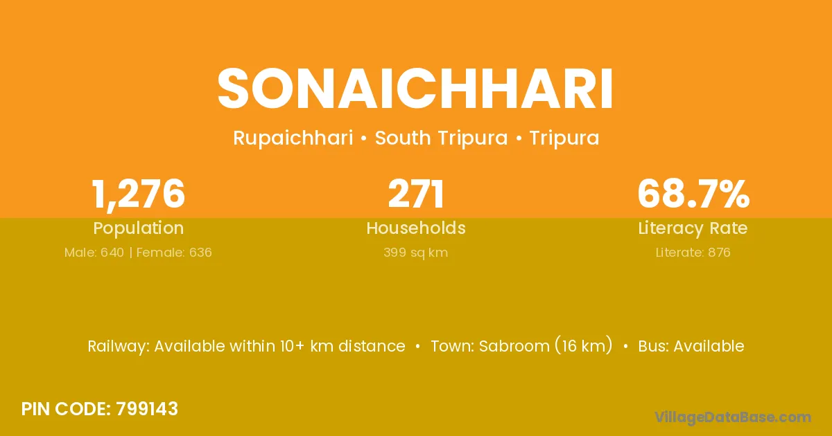 Sabroom (16 km) is the nearest town to Sonaichhari village for major economic activities and is located approximately 16 km away.
