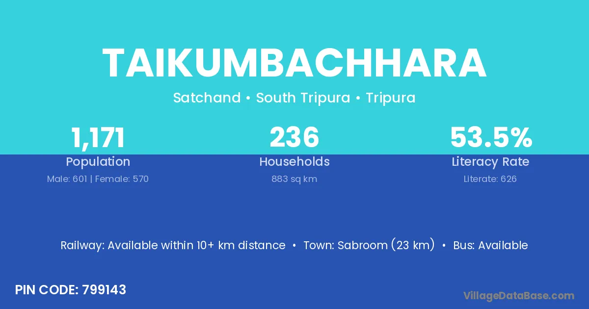 Sabroom (23 km) is the nearest town to Taikumbachhara village for major economic activities and is located approximately 23 km away.