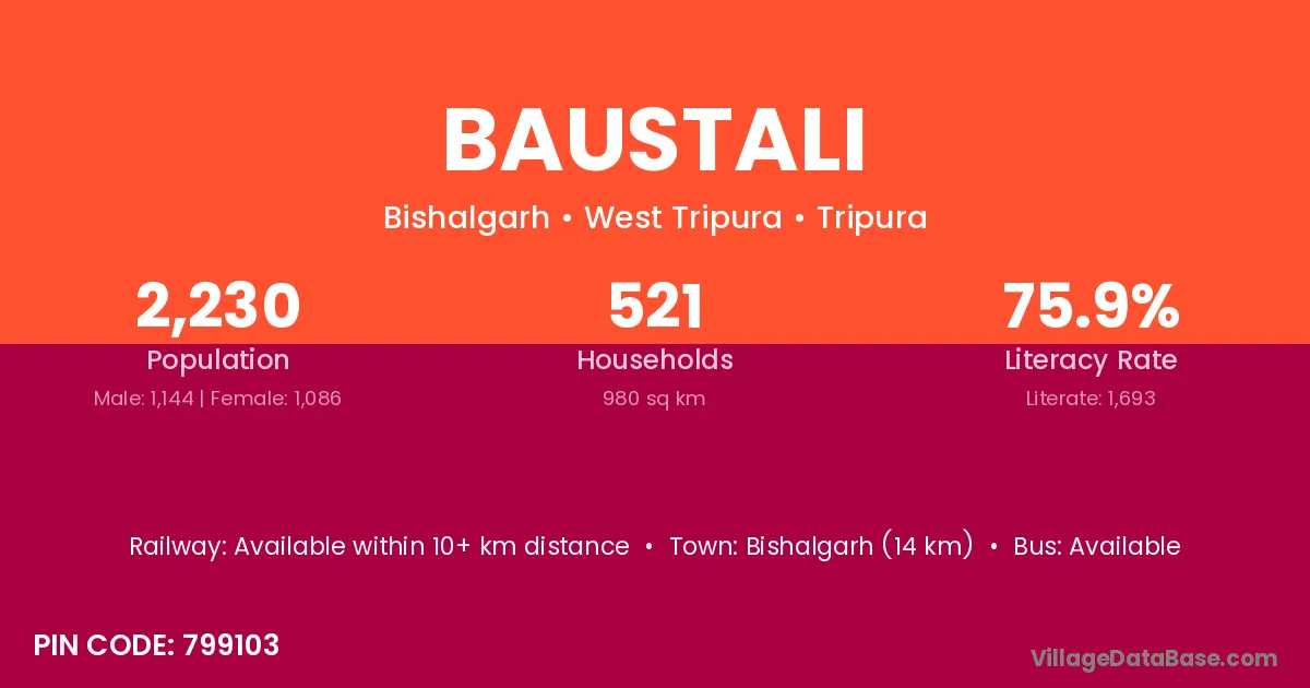Bishalgarh (14 km) is the nearest town to Baustali village for major economic activities and is located approximately 14 km away.