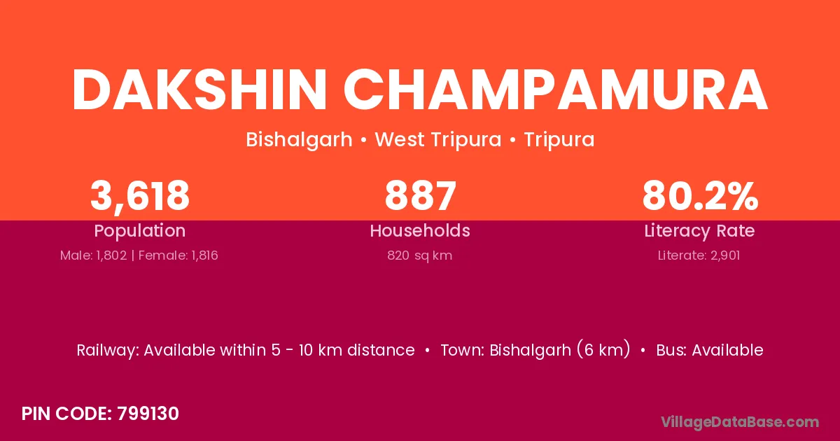 Bishalgarh (6 km) is the nearest town to Dakshin Champamura village for major economic activities and is located approximately 6 km away.
