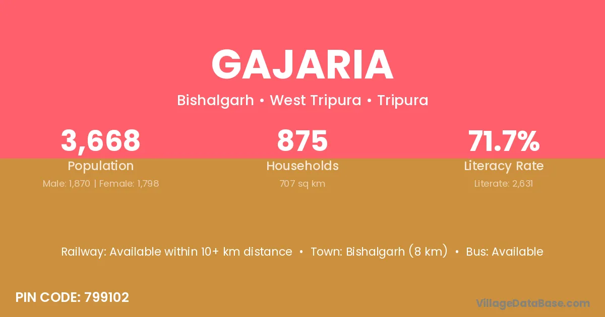 Bishalgarh (8 km) is the nearest town to Gajaria village for major economic activities and is located approximately 8 km away.