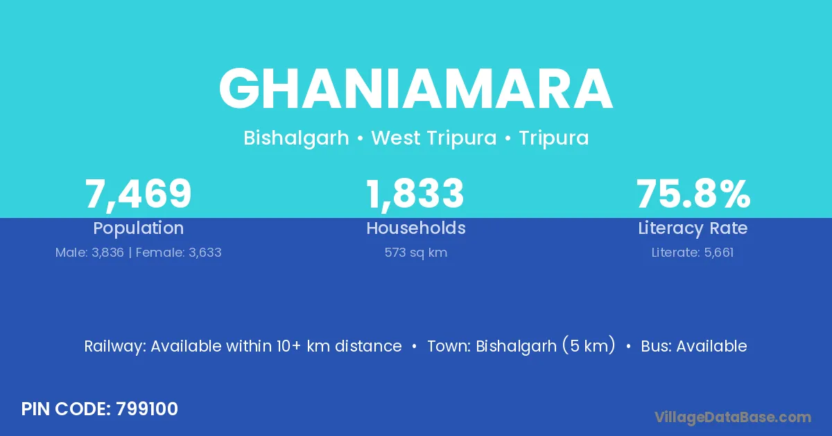 Bishalgarh (5 km) is the nearest town to Ghaniamara village for major economic activities and is located approximately 5 km away.
