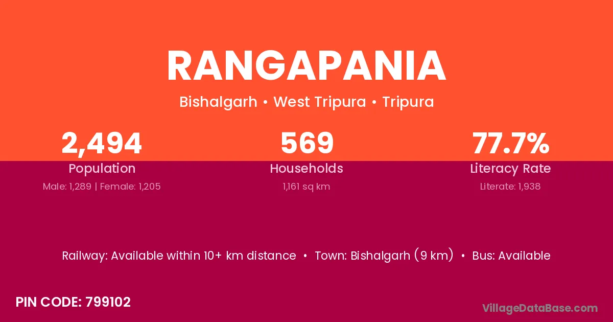 Bishalgarh (9 km) is the nearest town to Rangapania village for major economic activities and is located approximately 9 km away.