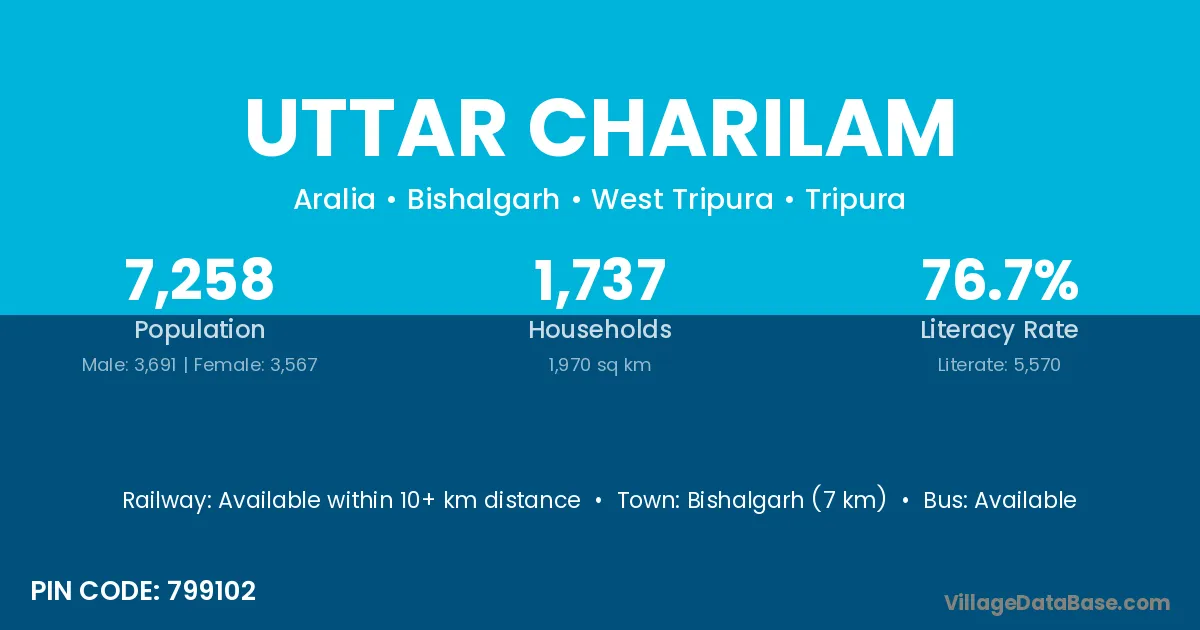 Uttar Charilam village has a total population of 7,258 people, of which 3,691 are males and 3,567 are females.