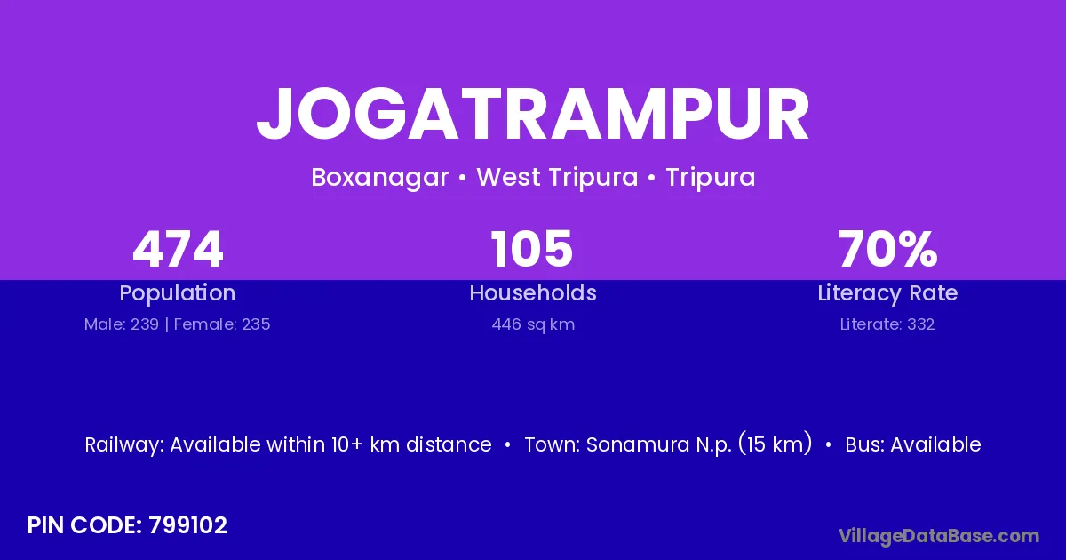 Sonamura N.p. (15 km) is the nearest town to Jogatrampur village for major economic activities and is located approximately 15 km away.