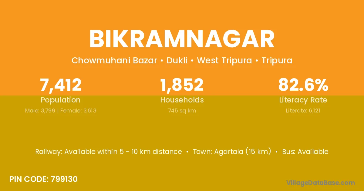 Agartala (15 km) is the nearest town to Bikramnagar village for major economic activities and is located approximately 15 km away.