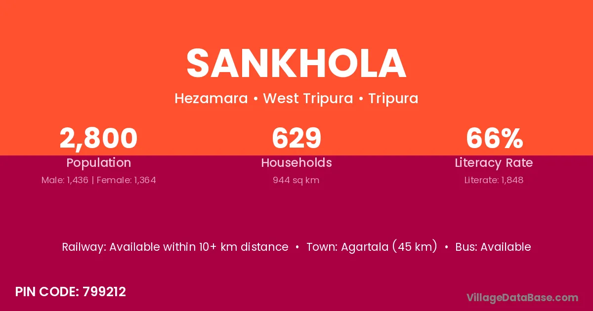 Agartala (45 km) is the nearest town to Sankhola village for major economic activities and is located approximately 45 km away.
