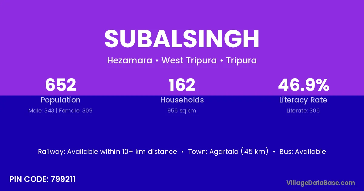 Agartala (45 km) is the nearest town to Subalsingh village for major economic activities and is located approximately 45 km away.