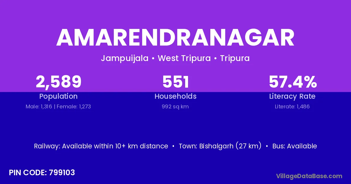 Bishalgarh (27 km) is the nearest town to Amarendranagar village for major economic activities and is located approximately 27 km away.