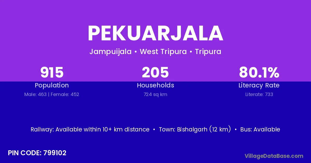 Bishalgarh (12 km) is the nearest town to Pekuarjala village for major economic activities and is located approximately 12 km away.