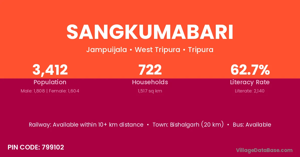 Bishalgarh (20 km) is the nearest town to Sangkumabari village for major economic activities and is located approximately 20 km away.