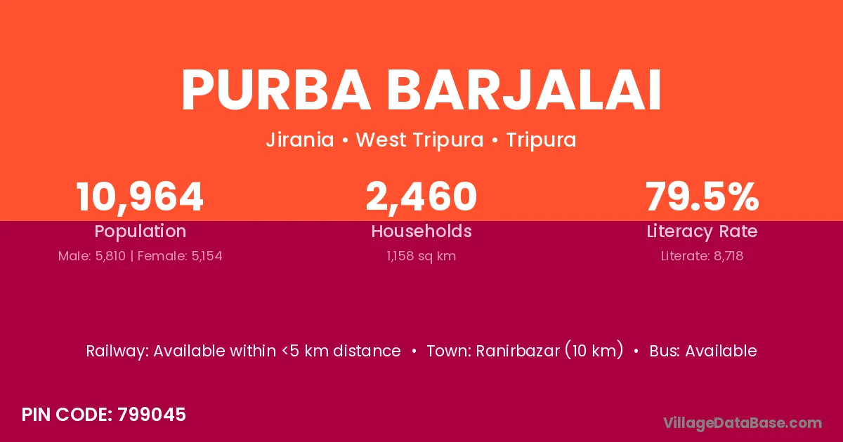 Purba Barjalai village has a total population of 10,964 people, of which 5,810 are males and 5,154 are females.